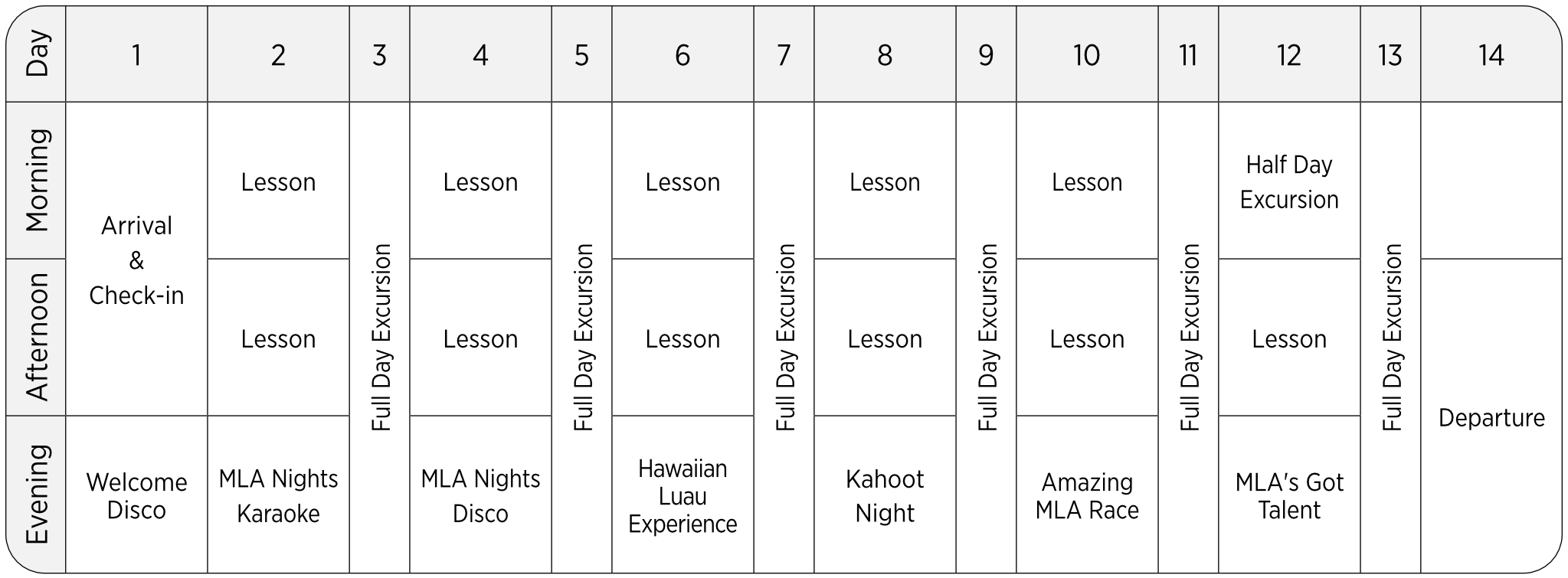 В программу входит: обучение, проживание, 3-х разовое питание, ежедневные экскурсии, спортивные занятия, дискотеки 2 раза в неделю, получение сертификата по окончании программы.